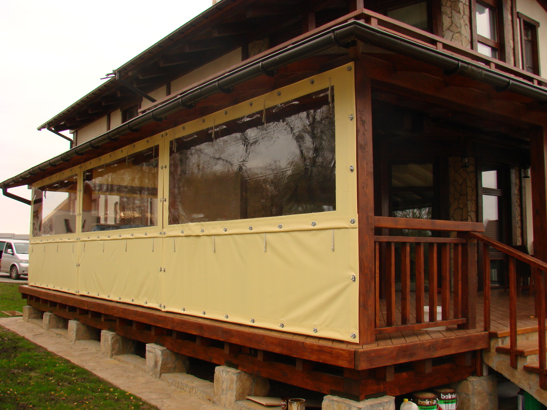 Гибкие окна используются как шторы, защищающие от ветра, дождя, насекомых и одновременно выполняют функцию отличного оформления веранды или кафе